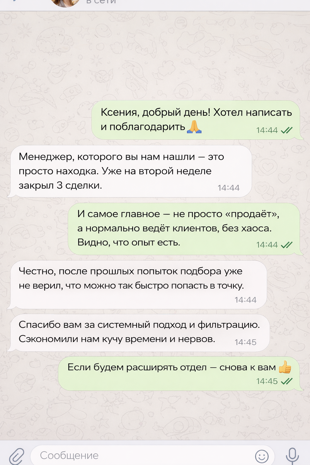 В процессе подбора я веду воронку и регулярно фиксирую промежуточные результаты: количество обработанных кандидатов, причины отказов, текущие статусы и прогноз по срокам. При необходимости корректирую профиль кандидата и каналы поиска, чтобы не терять время и довести вакансию до результата — выхода сотрудника.